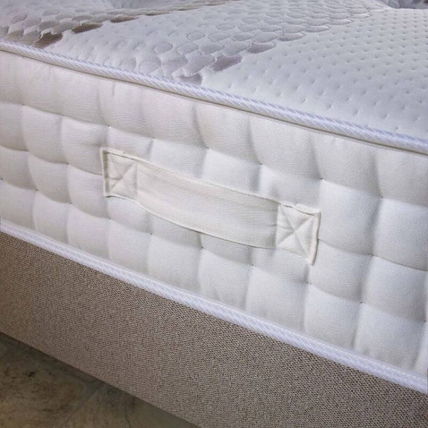 It is finished off with handles and air vents for a better air flow. The Mattress topped with a layer of Latex, Deep Wool Filling for the ultimate supportive layer. Latex is long lasting and very durable and is one of the best mattress fillings for back support. It is topped with Belgian knitted fabric to give the mattress an overall luxurious feel. The base that this mattress sits on is of a solid timber construction, and has wooden corner feet, which help to keep it sturdy and makes it more appealing.